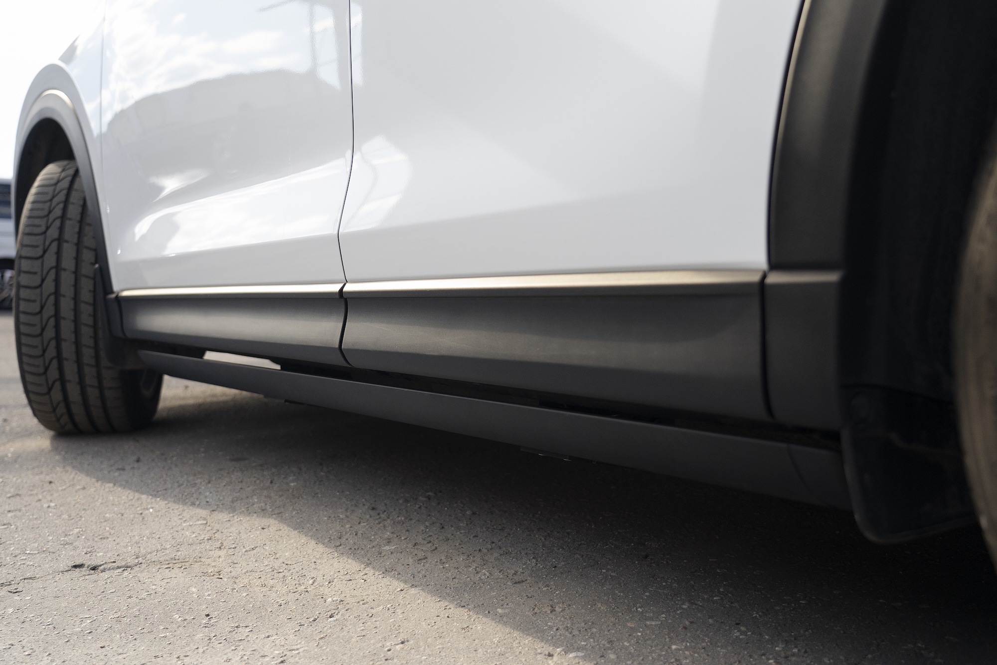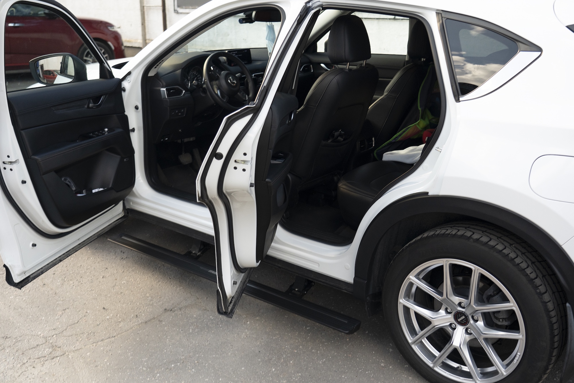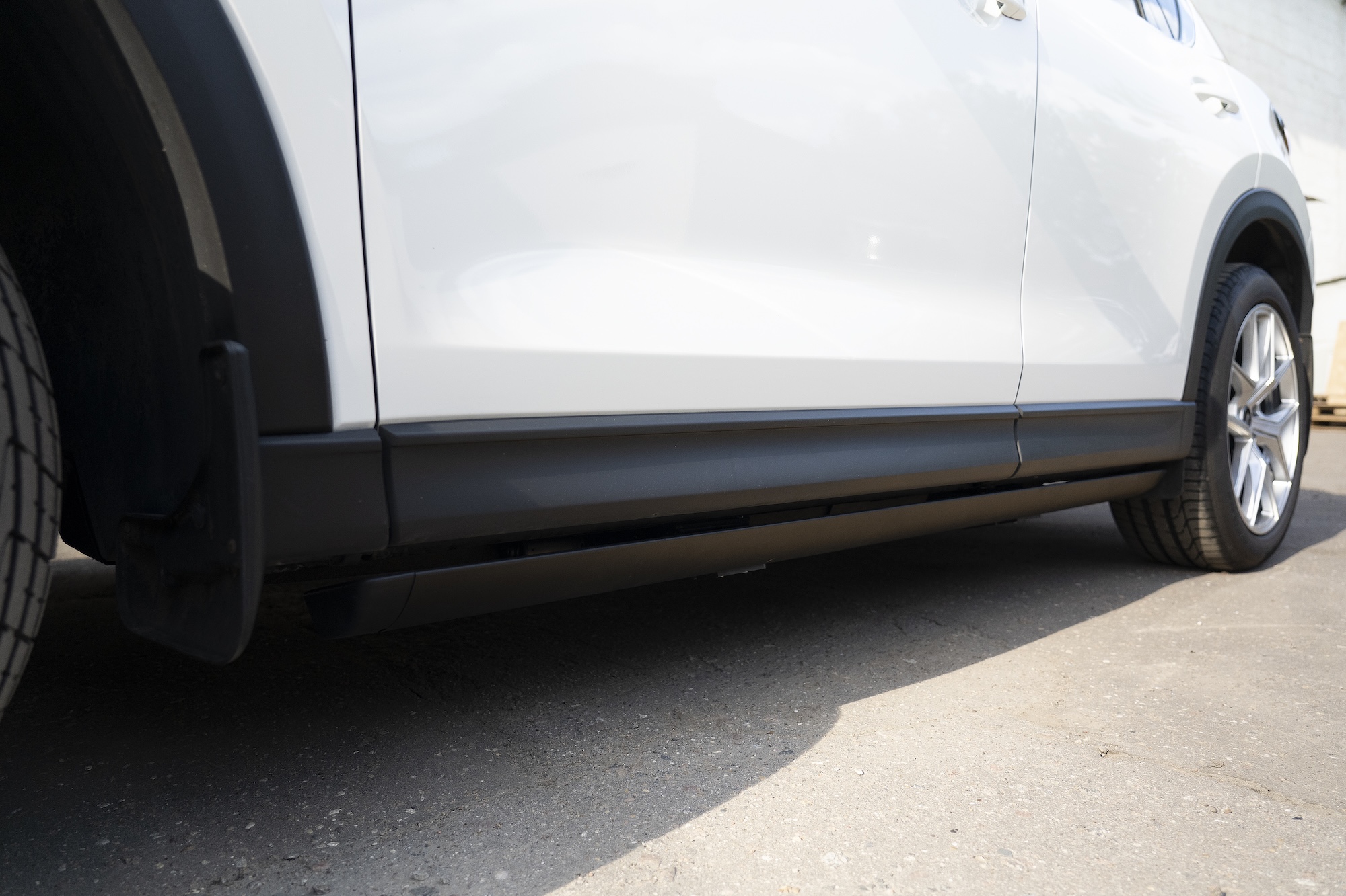 Retractable electric thresholds ATS on Mazda CX-5. On this vehicle, they will also be practical and convenient for elevation and landing. In the retracted position under the body of the car, the footrests look very neat. They can be pulled out from opening any door. Especially convenient for small children, so they are more fun and easier to jump into the car. But the sills can easily withstand two adults as well - they are designed for 200 kg. Warranty 2 years. We also perform maintenance of sills with disassembly of brackets.