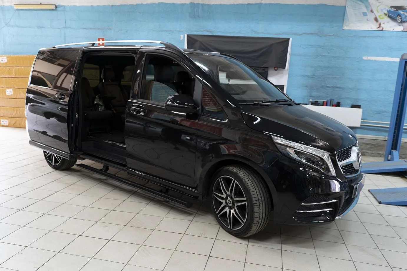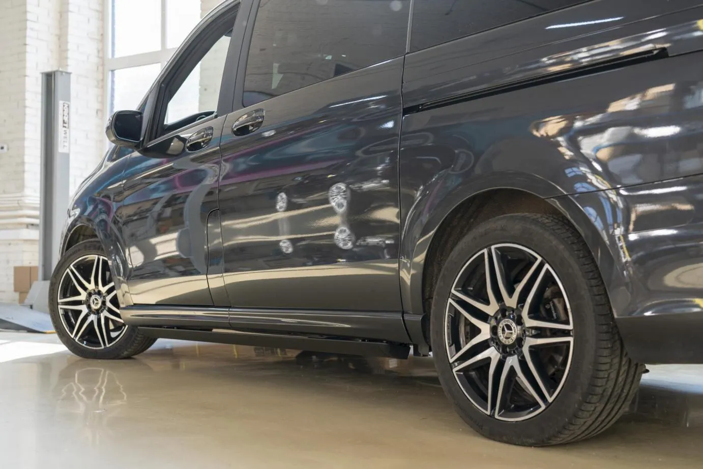 Mercedes V-class sills can be optionally installed on the left and right sides or only on one side. The folding mechanisms of our sills are protected against dirt, dust, snow, water. Plus we install additional mudguards that cover the sill mechanisms when folded. For this vehicle, retractable footrests are especially relevant. The driver and passengers will appreciate the convenience of getting in and out of the car. The warranty on the retractable footrests is 2 years. We perform maintenance of the sills.