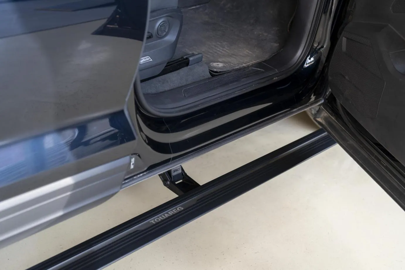 Premium Electric Side Steps // For this luxury SUV build, the Gangsta Paradise automatic running boards serve as the ultimate accessibility upgrade, proving that style and function can coexist seamlessly. Outfitted with integrated LED lighting, these steps were custom-configured at the client's request, who approached us after market options failed to meet both durability and design standards. The goal was to create steps that looked OEM+ while providing superior weather resistance. To complete the transformation, custom rubber tread inserts were added, allowing surefooted entry in all conditions—yes, even mountain terrain. The result is a perfect fusion of utility and urban sophistication.