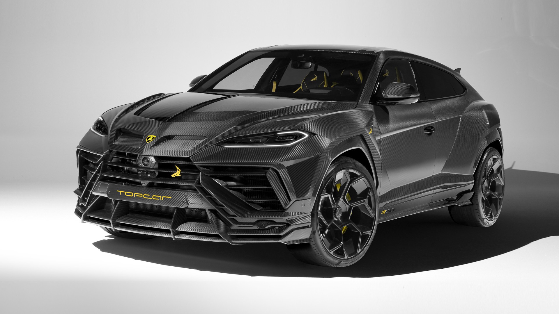 Predatory sharp gaze, wide carbon body, stylish wheels with a large offset, swift hood with air ducts, voluminous faceted wings, clean surfaces of the fifth door, rear lighting accentuated by a laconic edge — this is the new Lamborghini Urus SE with a hybrid powertrain in R’Evo design by TopCar Design.