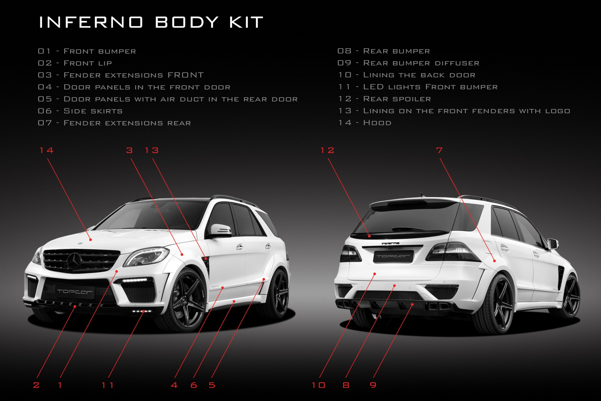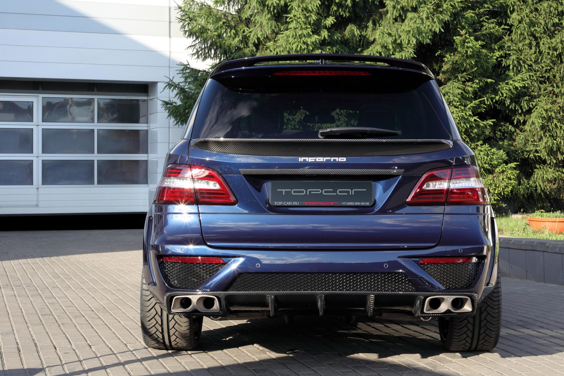 TOPCAR announces the start of work with Mercedes-Benz cars. The first project - an aerodynamic body kit for the ML 63 AMG, which was called "INFERNO". Subtle sense of style, conciseness, harmony, and powerful energy of the winner – these are the concepts that we have tried to integrate in the new project. Black Series by Mercedes-Benz was the inspiration for us to create this body kit.Aero-kit consists of front and rear bumpers, Fender extensions, overlays on the door trims on the front wings, sills, bonnet, spoiler on the fifth door and tips on the exhaust pipe. Additional LED lights integrated into the front bumper. Traditionally, aerodynamic body kit made of carbon fiber and Kevlar using the technology of vacuum forming. Engine modification program (by EVOTECH Motorsport):1. Increasing power to 640 hp and torque to 980 Nm2. Increasing power to 690 hp and torque up to 1,100 Nm3. Increasing power to 760 hp and torque to 1150 NmLogical continuation of the exterior tuning - tuning interior. Every interior is created individually to meet unique customer needs.
