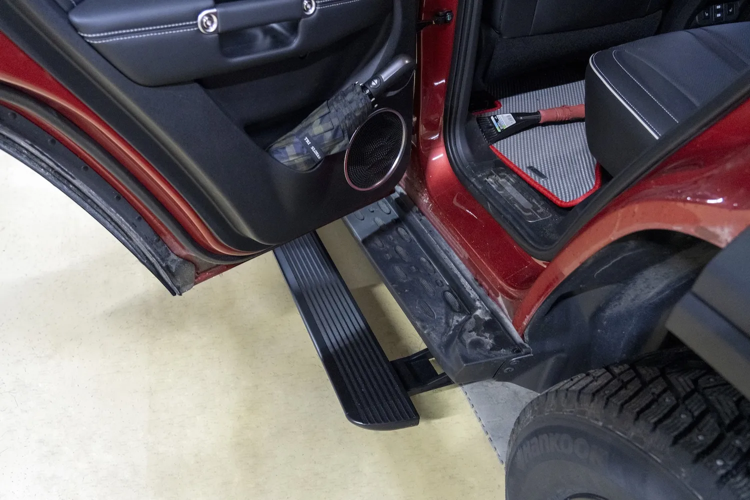 Premium Electric Side Steps // For this luxury SUV build, the Gangsta Paradise automatic running boards serve as the ultimate accessibility upgrade, proving that style and function can coexist seamlessly. Outfitted with integrated LED lighting, these steps were custom-configured at the client's request, who approached us after market options failed to meet both durability and design standards. The goal was to create steps that looked OEM+ while providing superior weather resistance. To complete the transformation, custom rubber tread inserts were added, allowing surefooted entry in all conditions—yes, even mountain terrain. The result is a perfect fusion of utility and urban sophistication.